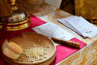 Коли ж і згрішив він, та не відступив від Тебе і безсумнівно в Отця, і Сина, і Святого Духа, Бога, Тебе, в Тройці славимого, вірував і одиницю в Тройці і Тройцю в одиниці православно аж до останнього свого подиху визнавав, будь милостивим до нього і віру в Тебе замість діл прийми і з святими Твоїми, як Щедрий, упокой. Нема бо чоловіка, що жив би і не згрішив. Ти один тільки без усякого гріха, і правда Твоя – правда вічна, і Ти один Бог милости і щедрот і чоловіколюбства‚ і Тобі славу возсилаємо, Отцю, і Сину, і Святому Духові‚ нині, й повсякчас, і на віки віків.